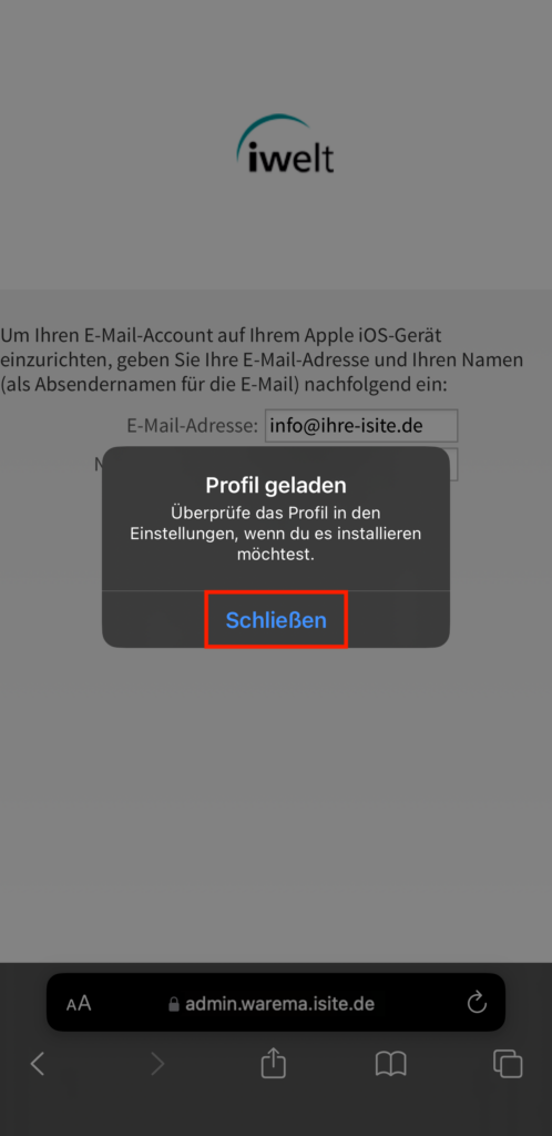 Sobald das Profil heruntergeladen wurde, erhalten Sie folgende Meldung, klicken Sie auf „Schließen“ :