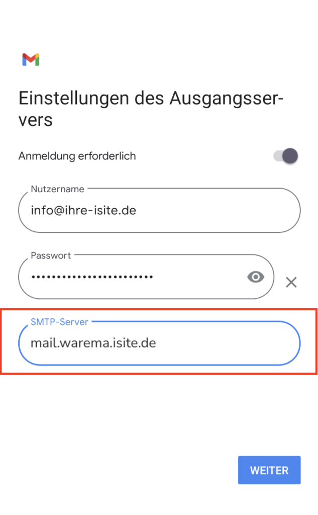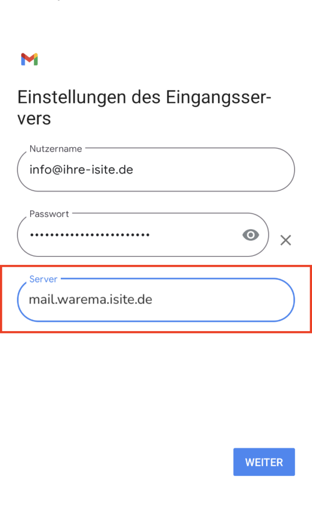 Geben Sie als Eingangsserver „mail.warema.isite.de“ an: