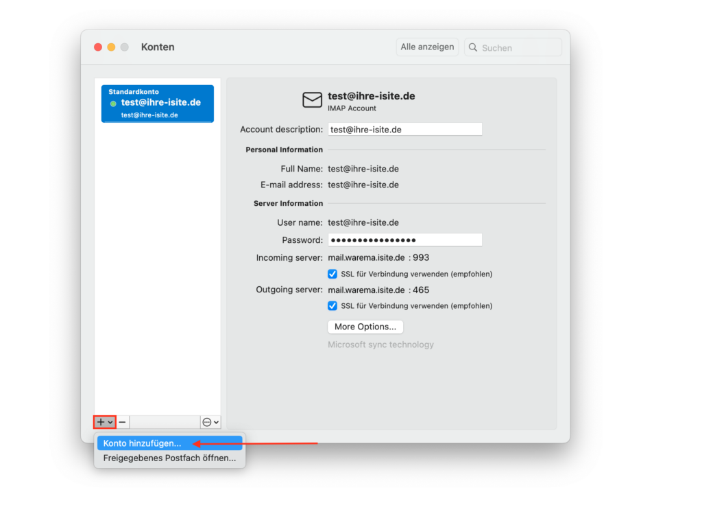 Wenn Sie ein weiteres Postfach hinzufügen möchten, müssen Sie im folgenden Fenster unten links auf das +-Symbol klicken und dann „Konto hinzufügen…“ auswählen: