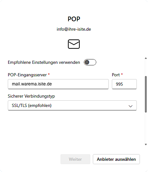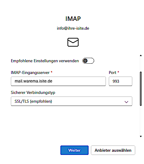 • IMAP-Eingangsserver: mail.warema.isite.de
