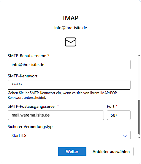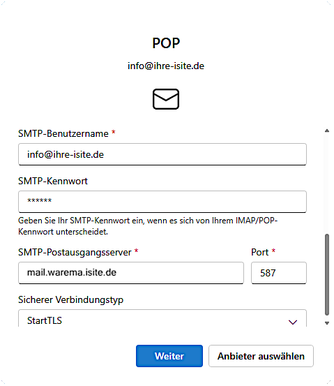 • SMTP-Postausgangsserver: mail.warema.isite.de